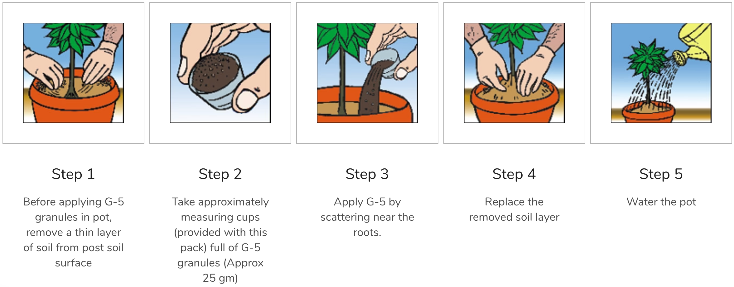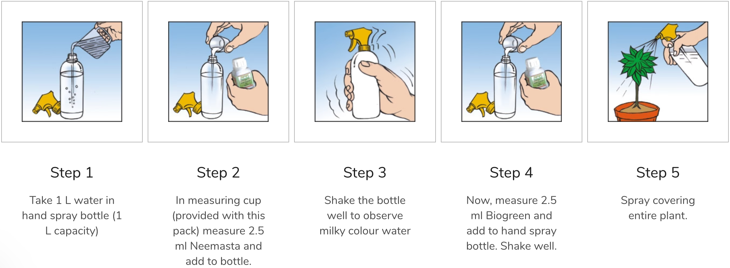 The leaves of the plant should always be kept clean, as they are porous and the plants breathe through them. Hence, it is essential to wash the plants well with a plant shampoo or spreader like 'I-soap' and water. The use of neem oil-based insecticide, which is part of your Eco Home Garden Kit, is advised to protect your plants from diseases caused by insects and fungus. Use the hand spray pump for this. Also, for overall growth, add the granular fertilizer 'G-5' (25 gm per pot) to the pot and spray your plants with the plant tonic 'Biogreen' (2.5 ml per liter of water).